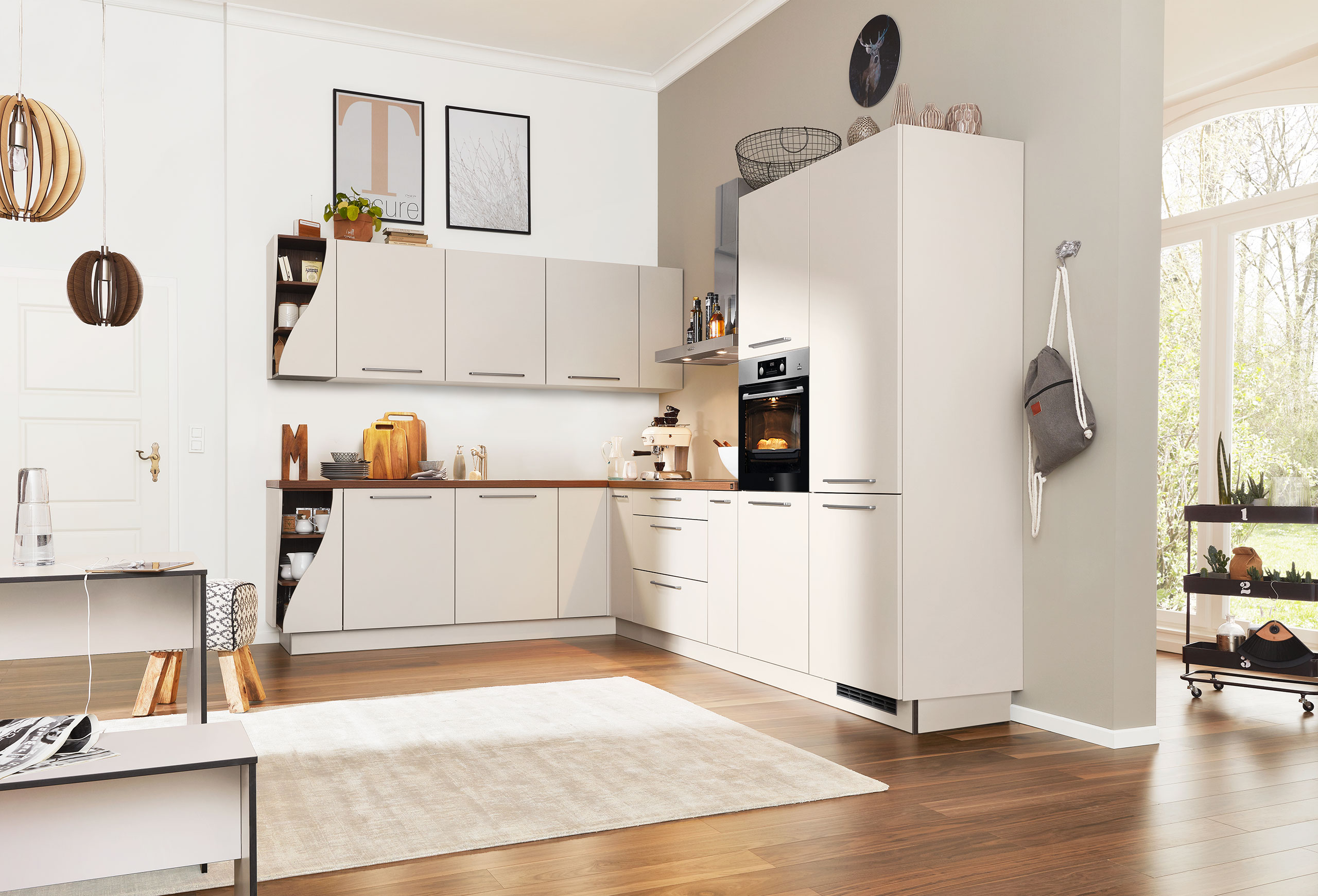 Winkelküchen können ganz unterschiedlich aufgebaut sein. Ob beide Schenkel gleich oder unterschiedlich lang sind, hängt von der Raumgröße und von Ihren persönlichen Präferenzen ab. Wenn Sie nur einen kleinen Raum zur Verfügung haben, ist die Küche in L-Form eine ideale Entscheidung. Ebenso gut eignet sich dieses Format aber auch für offene Wohnküchen und für sehr große Räume. Wichtig ist, dass L-Küchen fachkundig geplant werden. Um alle Vorteile der Küchenform zu erhalten, muss die Anordnung der Elektrogeräte und der Spüle stimmen. Hier haben Sie viel Spielraum in der Planung, sodass Sie Ihre Küche für Links- oder Rechtshänder ausstatten können. Dazu kommt, dass Sie jeden Winkel optimal nutzen und durch die L-Form der Küchenanordnung viel mehr Stauraum als bei anderen Küchenformen haben. Befindet sich Ihre Küche in einem Raum mit Dachschrägen, ist die L-Form besonders praktisch. Denn das Winkelformat sorgt dafür, dass Sie unter Schrägen und Fenstern mehr Arbeitsfläche zur Verfügung haben. Wo Sie Hängeschränke einplanen, hängt von der Form und Höhe des Raumes ab. Eine L-Küche können Sie ohne Probleme auch dort einbauen, wo Sie die Heizung und ein Fenster beachten müssen. In diesem Fall geht die Arbeitsplatte ums Eck, während das Fenster und die Heizung nicht von Schränken bedeckt werden. Ein weiterer Vorteil der L-Form ist, dass Sie Ihre Küche zu beiden Seiten nach Belieben erweitern können. Ziehen Sie um und haben mehr Platz zur Verfügung, finden Sie problemlos die passenden Küchenschränke. Hier wäre lediglich eine Erweiterung der Arbeitsplatte nötig.